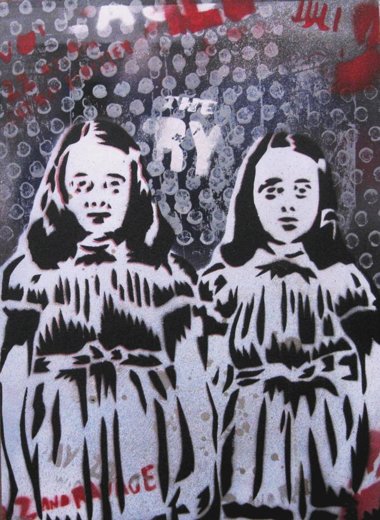 Representation of actresses Louise and Lisa Burns in the film The Shining directed by Stanley Kubrick in 1980. Unique artwork made with manual and experimental printing techniques. Includes textures and corrosion effects using sprays and acrylic paint on recycled gray cardboard in good condition. I...