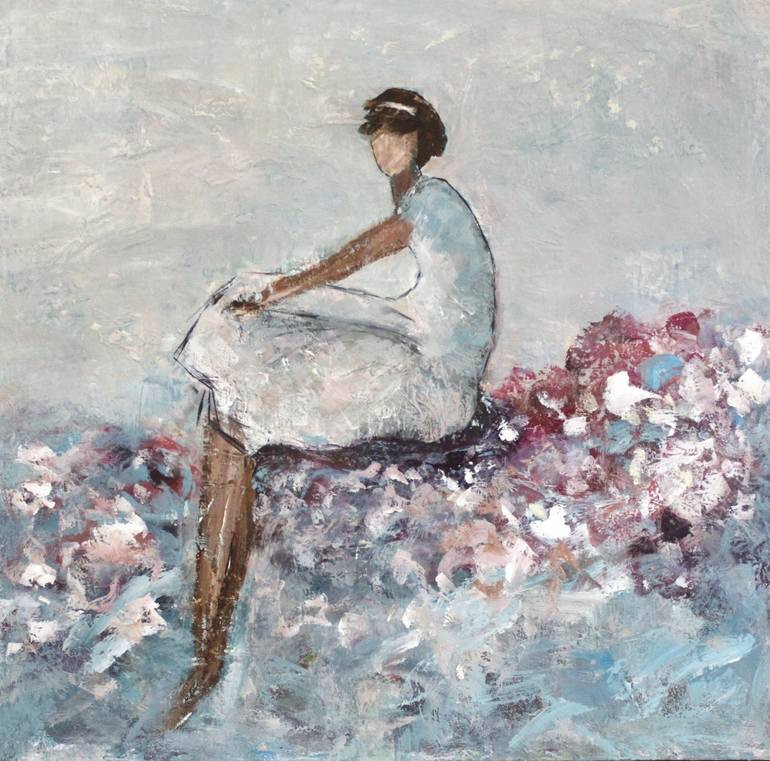 Figurative piece of a lucky girl sitting on a pile of beautiful dreams. Created with a layer of washi paper on canvas for added texture.