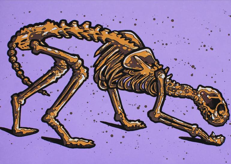 This original painting, "Skeleton," presents a violet cat skeleton strolling through a field, a vision drawn from a parallel universe. The artist's unique perspective blends the familiar with the surreal, offering a glimpse into an alternate reality. Crafted with acrylic, ink, and watercolor on pap...