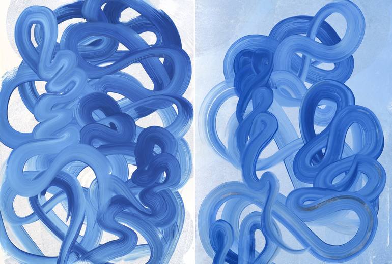 The elegant dance of the flying birds in the sky. The freedom and joy of being. Acrylic blue tone color brush marks on acid-free paper. Diptych, each piece is 30 x 22 in. Altogether is 30 x 44 inches. Can be displayed together or separately. Ready to frame.