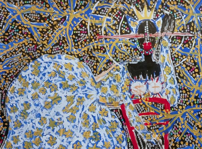This work is subtitled: Selfie as Imakatt2 (the hybrid cat character) With Red Chair in Exploding Orchard Part of my "Cosmosis Series" In this series, I had set out to continue my narrative of our yearning for the stars, or of the universe within us reaching for the universe at large...and then came...