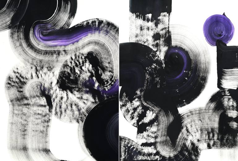 The speedy sky highway crosses the space and time. Acrylic with iridescent color brush marks on acid-free paper, two pieces. Each one is 30 x 22 inches. Altogether is 30 x 44 inches. Can be displayed together or separately. Ready to frame.