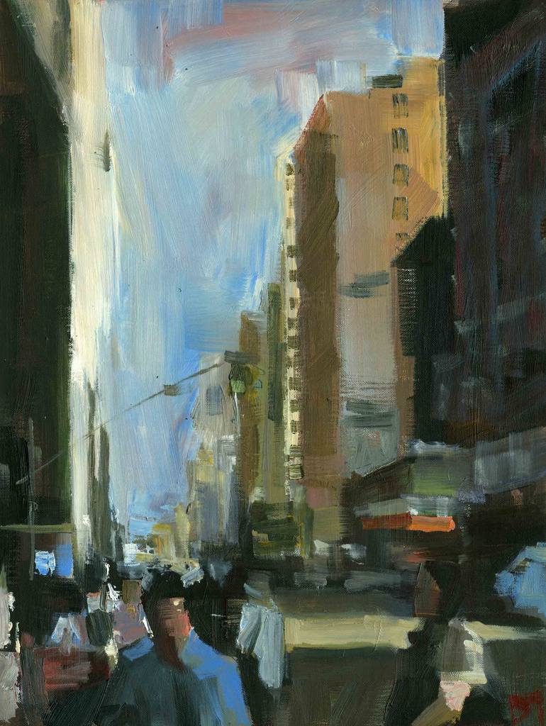 Skyscrapers is part of a series depicting the urban landscape. I use subdued colors and loose brush strokes, as in most of my paintings, in order to create the mood and feel of an urban setting. Art buyers may see a symbolic reference to prominent 20th century American painters like George Bellow...