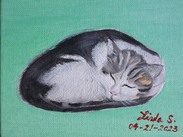 "Sleeping Cat" is my original oil painting on canvas panel 7"x5"x0.2" I used green color as background and I just used white and black two colors for the cat. It is very cute. It is a beautiful piece for art collections and for animal lovers. As a gift to animal and nature lovers.