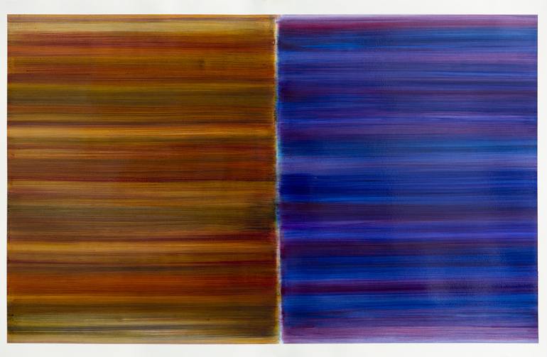 Painting: Acrylic ink on cotton paper. Inspired on Mark Rothko's floating shapes. Cintia García allows elements of chance to dictate the composition of the painting. She begins each work by tracing paint directly onto the paper. From there, her process is highly technical and laborious, as she cov...