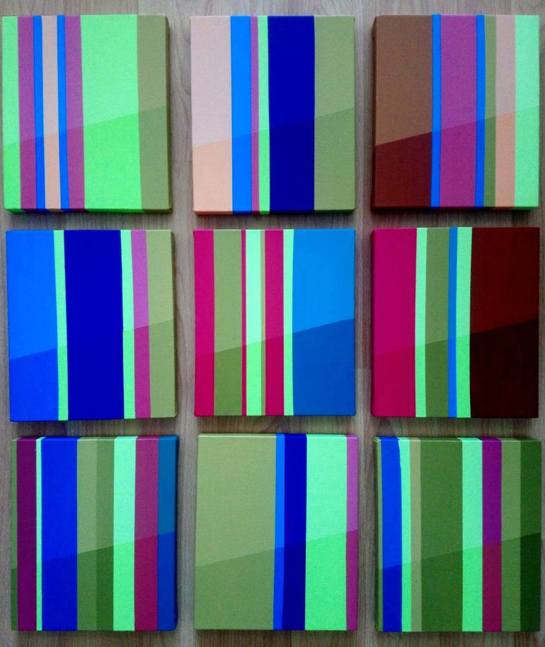 A total of 9 pieces of geometric abstract work in 25x20 cm size. 75x60 cm footprint.
