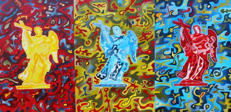 Triptych representative in an ironic play on the slot machine. the angel and the representation of Bernini's statue which is located in Rome on the deck in front of Castel Sant'Angelo.