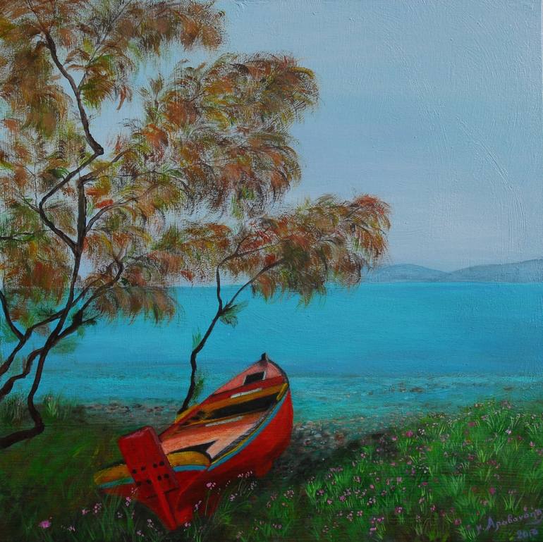 A small red boat was gently moistened by the sea with a companion to the cedar tree and surrounded by beautiful little flowers, a great spectacle in my eyes, and I wanted to take it to the camvas.