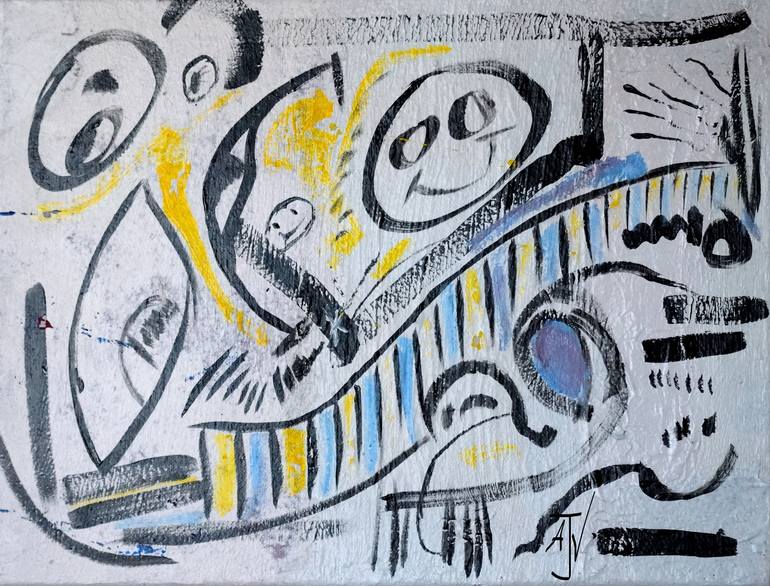Acrylic in Canvas - used canvas over painted and then left to the imagination. Every once in a while I'd walk by and add something... as the mood took me.