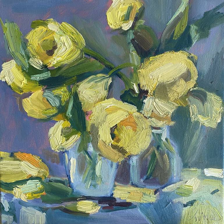 Yellow is a color associated with positiv vibes and happiness, epitomized by the iconic yellow smiley face. I thought it was very fitting to title this cheerful artwork "Tulip Smiles". The dimensions of the original painting on canvas measure 30x30x2 cm, and it has the potential to be replicate...