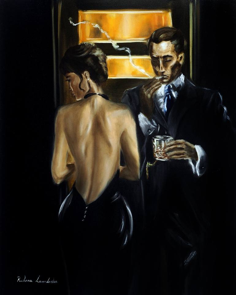 Cinematic and enigmatic, this original oil painting evokes the timeless allure of classic noir. A woman stands with her back to the viewer, her figure gracefully revealed by the open back of a sleek black dress. Her posture suggests quiet confidence, poised between intimacy and mystery. Opposite he...