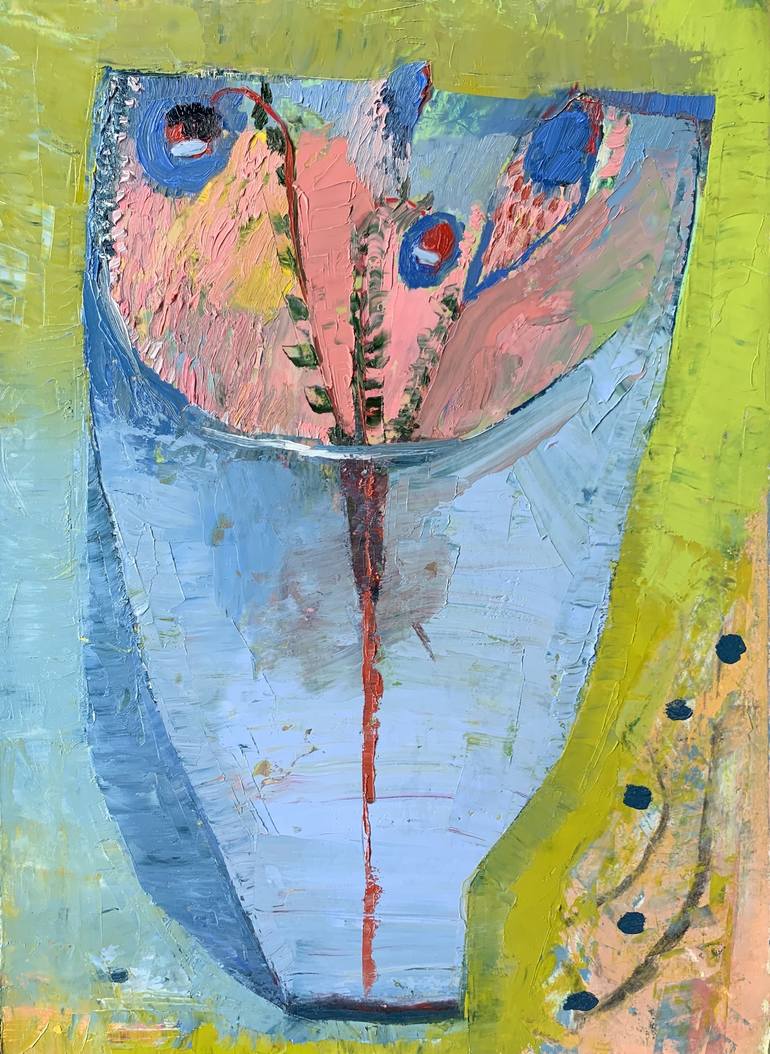 I am working on abstract landscapes, my original terrariums that are flattened out and simplified shapes of wild flowers and abstract nudes that are distorted and shortened and exaggerated