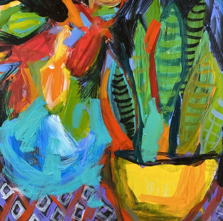 This painting is inspired by bold color, pattern and texture found in a summer garden. It is painted on a cradled wood panel. The edges of the panel are painted black. The piece will be signed on the front and is signed, titled and dated on the reverse. Hardware is attached and it is ready to hang.