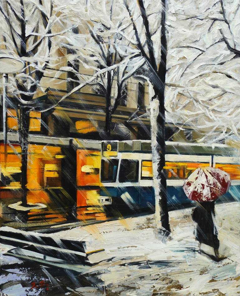 Inspired by the cityscape of Zurich in snow. Painted with brushes in oil on canvas. Ready to hang. Canvas will be sent on a wooden stretcher, and the sides are painted.