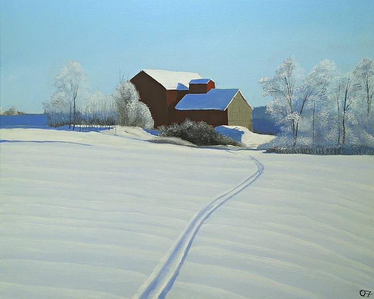 This is a snowy winter scene of a barn and field with a trail cutting through the icy landscape. One perhaps walked by the farmer who not long ago was reaping the harvest that was once filled that field. Signed bottom right. This painting comes varnished and is made using only the most archival mate...