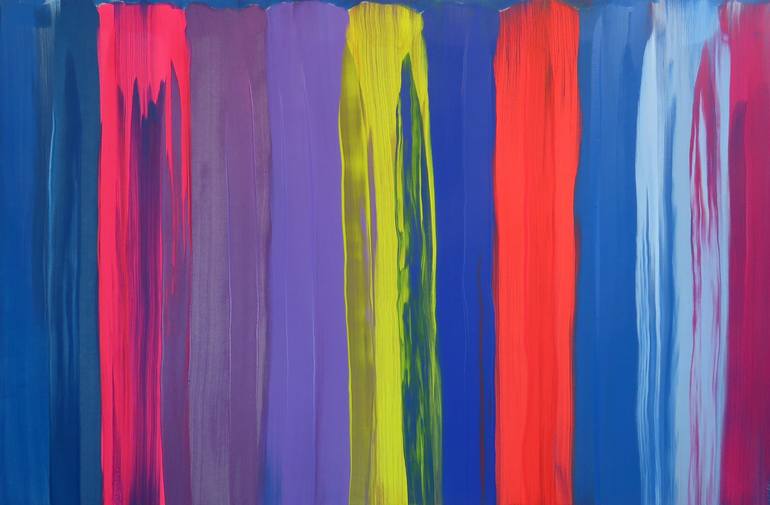 Large abstract expressionist acrylic on stretched canvas. Highly saturated pigments form a design with a relatively "minimalism" aesthetic. Sides edges are painted. Large format 46" x 70" when stretched. Arrives in a tube for easy shipping.