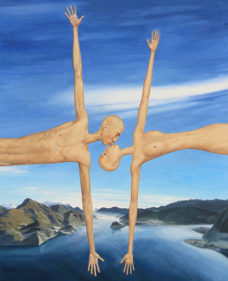 "Soaring over Como Lake" represents a couple united in an airy kiss, in an elegant and impossible posture. In search of harmony and timelessness, they transcend the limits of the material world. The human being is my subject. Since a striking dream, my characters are always naked and bald, to acces...