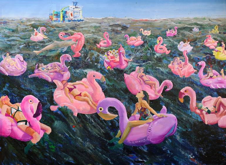 Virtosu’s paintings invite viewers to inhabit the weird tension between familiarity and strangeness. Being an adept of crude metaphors and not afraid to be emphatic about it, Dominic Virtosu is exploring the actuality and in-actuality of painting. With his solid work experience in the field of advertising, he is playing with its lively chaos of imagery and creates a sort of “peinture d’essai”. The artists’ desire to shock, to provoke, to hurt the retina, comes from his interior fracture: between revolt towards consumerist advertising and his simultaneous attraction towards its inexhaustible, toxic imaginarium. This is a painting style that is not “nice” nor is it “tame”. The artists’ meeting with Neo Rauch’s art and the neorealist movement at the Hochschule fur Grafik und Buchkunst in Leipzig under the tutelage of professor Annette Schröter has had a profound influence on his narrative style aș well aș on his technique. A Masters’ graduate at the Național University of Arts in Bucharest in the painting class of Professor Cătălin Bălescu, the artist has developped his own visual language made up of contemporary references, clues that he degrades in ironic and visual distopias („Memory Empty” - 2011, „See You Later” - 2019, “The Gathering – Bunny” - 2019, „Family” - 2021, "Good Vibes Only" - 2021 and “Fun Times” – 2022). Through the (de)valuing of iconography coded by advertisting, TV and influencers, Virtosu is enticing the viewer into a familiar and colorful screenplay. In works such as „Social Distancing” – 2021 – the artist sends a nod to the guru of art marketing - Jeff Koons’ „inflatables” series. The mystical dimension given to simulated success, is one of the themes that mirror the solitude and intimacy of the artists’ studio during quarantine. There is, of course, a lot of biographical material in these paintings. There’s the admission of a family that was profoundly hurt by the 50 years of communism in which they survived; this recollection is partially digested, in a cathartic, almost therapeutic way, in works such as „We come together” – 2019 and „The Ten Commandments” – 2019 – that are directly inspired by the vitality of the resistance in the countryside against the regime.