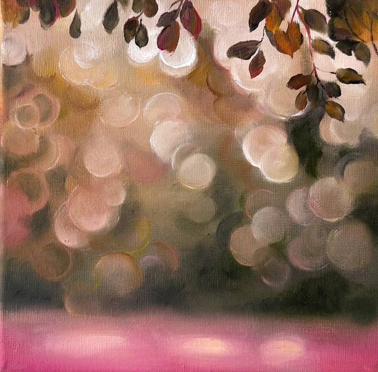 "Original oil painting on 20x20 cm canvas Features glowing bokeh light and soft forms Warm earthy palette with red, green, and gold accents Delicate, floating botanical details Hand-painted and signed by the artist Perfect for cozy spaces, creative studios, or peaceful interiors Description So...