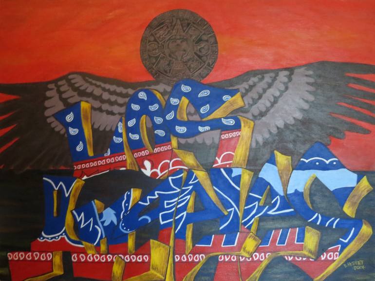 Inspired by Los Angeles gang culture, using the written word in the foreground, with a scape in the background, in this case a orange Los Angeles sunset. The symbolism within the letters represent blue and red rags which represent crip and blood gangs and a 5th Sun Stone symbol that represents Mexi...