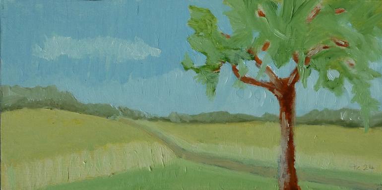 Imagine a serene summer day in the countryside, captured in this original oil painting. A golden grain field stretches towards the horizon, meeting a pathway that leads to a solitary tree. Friendly clouds drift across a fine blue sky, evoking a sense of stillness and peace. The colors of summer – ye...