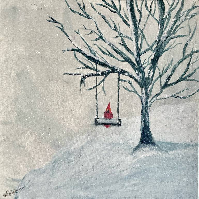 EN : This acrylic painting on a 100% cotton canvas captures a serene and melancholic winter scene. A bare tree, its branches stretching towards the gray sky, dominates the snowy landscape. Under the tree, a swing hanging from a low branch hosts a bright red bird, contrasting with the white and gray ...