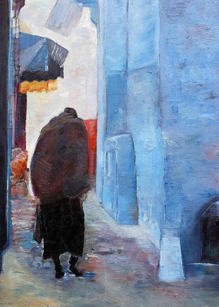 Solitude in blue is a oil painting I did as a souvenir of my trip to Morocco. It was an ephemeral instant during my holidays, I took a photo. A striking contrast between this old lady and the sunny atmosphere of the southern medina and the blue painted walls.