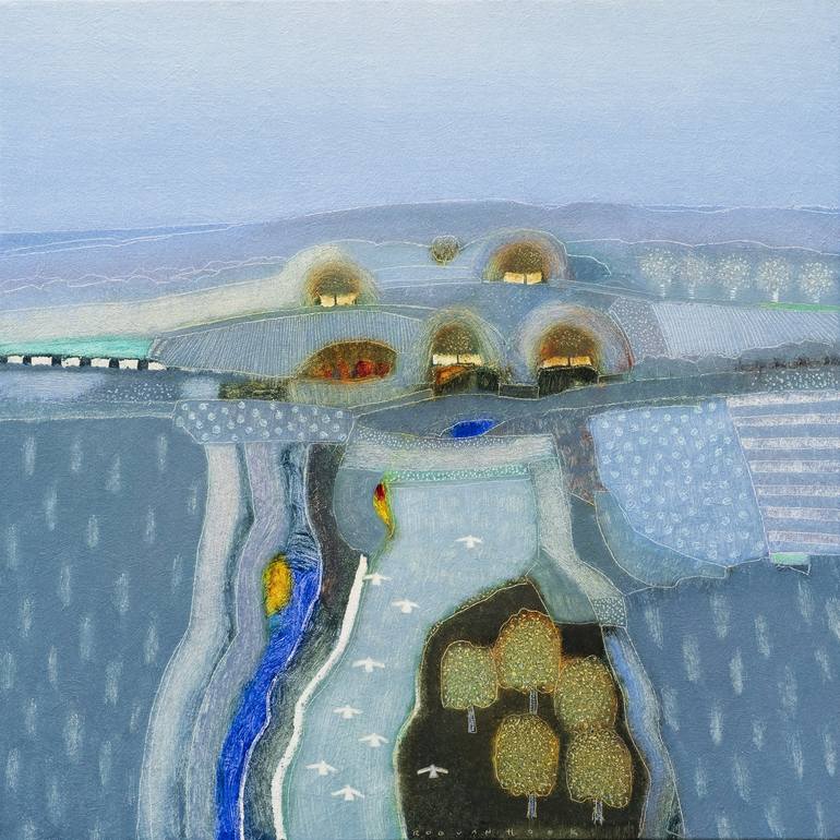 Landscape painting in blue colours, with some orange/yellow spots to spice it up. The title is from a song by The Simple Minds. (All the titles of my paintings are parts of song lyrics). The sides of the canvas are painted as well. Framed, ready to hang.