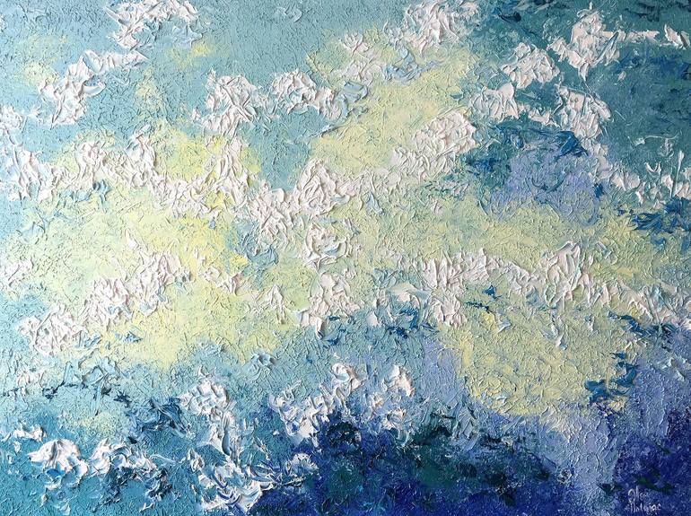 Sounds.Ocean.Vol.170. Contemporary Abstract Seascape - Original Oil Painting - Heavy Texture Impasto: Blue, White and Yellow. Signed on front. Painted edges. Artwork on supported wooden frame - stretched canvas. Wired and ready to hang, no frame needed. The painting "Sounds.Ocean.Vol.170" depicts ...