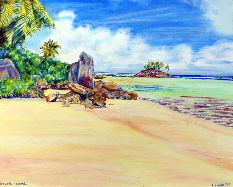 Original Oil Painting on Canvas Board, Framed This vivid portrayal of Isle Souris is a love letter to a place etched in my soul. Over more than 30 years in Seychelles, I have spent countless hours in the quiet company of this petite isle, watching its moods shift with the sky—from golden calm to te...