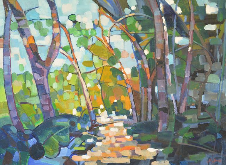 Cette œuvre présente une interprétation abstraite d'un sentier forestier inondé de lumière. Les arbres, hauts et élancés, entourent le chemin central qui s'étend vers l'horizon, créant une perspective. J'ai volontairement donné un style géométrique varié dominant la composition, fragmentant la scène...