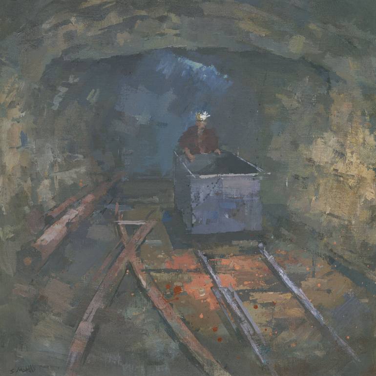 This is an original, one of a kind painting. A miner pushes a cart at South Crofty tin mine in Cornwall. The headlamp highlights the rich earth colours of the tunnel. South Crofty has a long history of copper and tin mining, going back over 400 years. I referenced old photos from the 1970's and 80's...