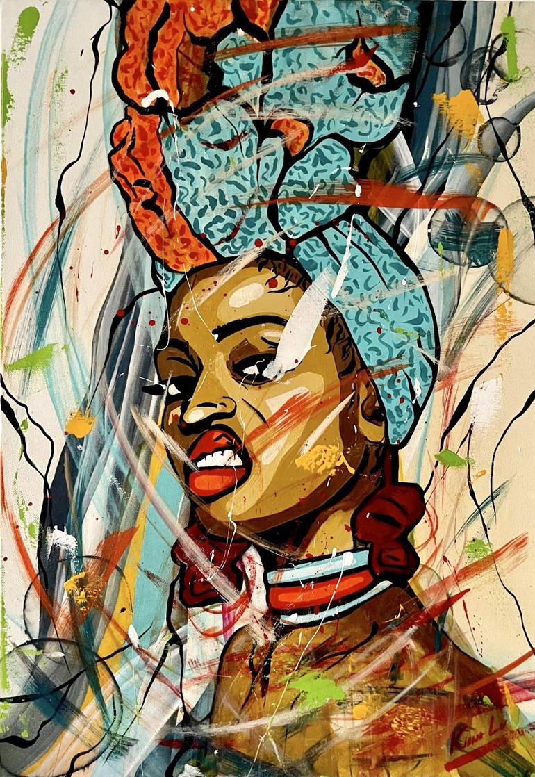 In this painting, a black woman with a sovereign spirit is depicted with power and grace. Her confident posture and regal attire reflect a strong sense of self-worth and resilience. The painting celebrates her cultural heritage and identity, emphasizing her beauty and inner strength. Through her pr...