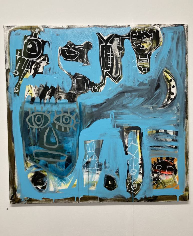I utilised the bright blue gloss in this painting. Tech symbols float in a fragmented arena. I let the symbols evolve to lend themselves animate qualities. I do this by drawing from the original source in an almost casual haphazard way. A kind of painting evolution, where tech symbols appear more na...