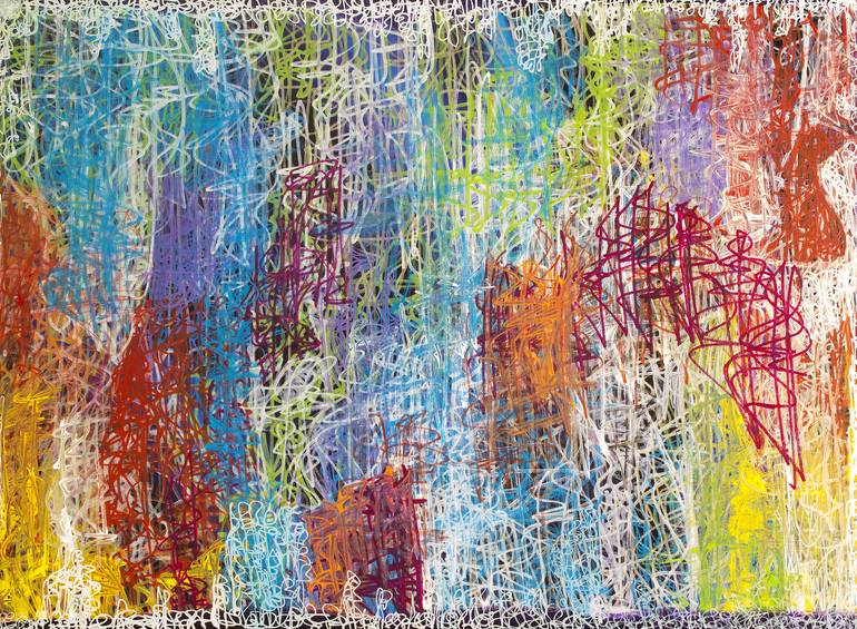 This painting emerges from the touch of oil markers on an acrylic-painted backdrop. Its luminosity radiates. A festival of colors unfolds against a pristine white background, creating a harmonious and vivid composition. The title of the painting derives from the interwoven lines reminiscent of pasta...