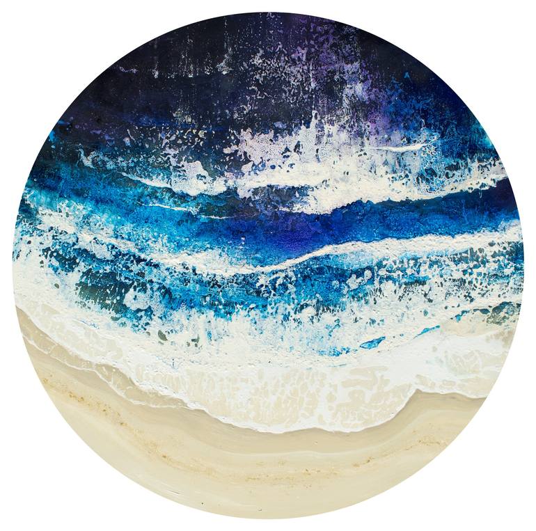 The painting is inspired by the night seascape view from a hotel terrace and is presenting a vast deep blue of the sea with sparkling lights and colors from the night streets of the city. Title: Sparkling Night Medium: Professional Acrylic and oil paints on stretched circular canvas, ready to hang ...