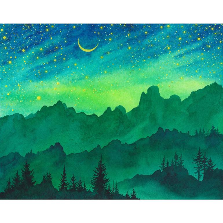 Sparkling night sky with glowing stars and a crescent moon over mountains handcrafted original watercolor painting.
