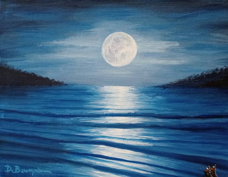 La notte e la luna protagoniste in questo dipinto. Mi affascina molto questo paesaggio così misterioso. Ecco perché ho voluto dipingerlo. La luna ci riscalda e ci fa compagnia come farebbe una persona cara. I colori sono ancora quelli acrilici