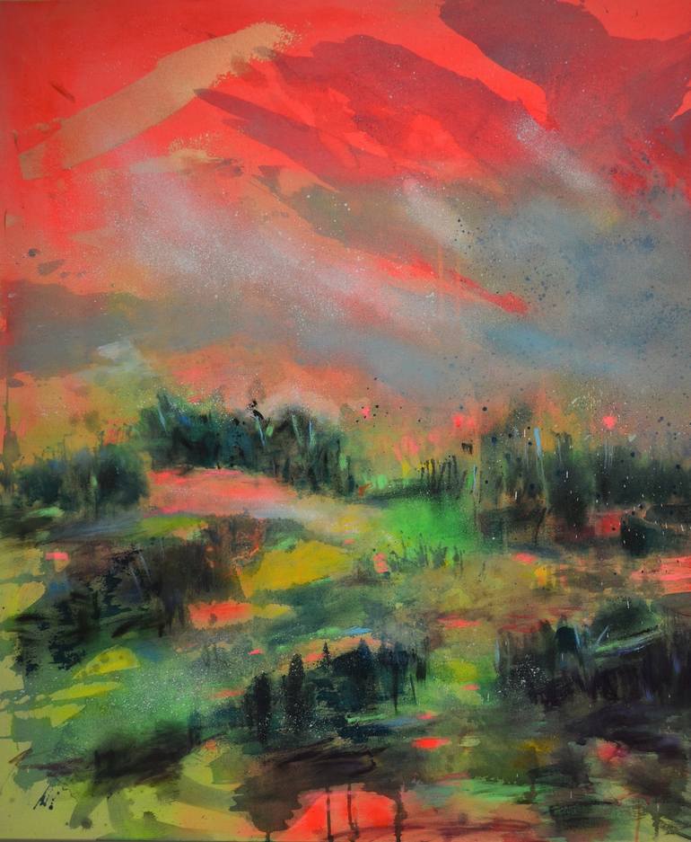 Tanja Vetter’s works show painting as alienation of a reality, where representational and abstract elements are imbued mutually with each other. Landscapes are her motif. Tanja Vetter’s countrysides of wood and mountainscapes, seascapes and staffage landscapes meet our eyes discomfortingly, melancholically and alienating. For, in spite of the closeness to the portrayed, unreal looking traits blend into the open spaces of the sceneries, make their way from tangible motif through its decomposition to the point of abstracted colour patches, warm and cold tinting colour gradients and surface structures. It is not the artist’s aim to depict nature, rather her landscape impressions shape themselves from painting; nature takes place in the process of painting. Her artistic repertoire ranges from expressive brushstrokes to dripped and blending oil paint; over and over the depth of space is sought after and penetrated by the autonomy of colour. In addition human figures in wide, sublime scenery; particularly the latest works include the figure, man into the colouristic landscape areas. These can be of quite symbolic nature and ask questions for the seemingly long gone desire and broken longing for the unity of man and nature. They let us discover and experience them again. Tanja Vetter gratuated in 2002 from the Freie Kunstakademie Mannheim, Germany. Her work has taken many turns in recent years: from abstract informal art to realistic painting – often broken by ironic elements and exploring its means and possibilities by itself.