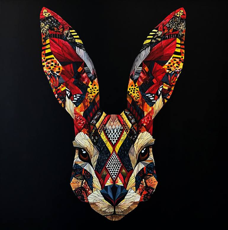 This artwork captures the fierce beauty of a hare, rendered in a striking geometric collage of fire-toned reds, golds, and blacks. The vivid patterns swirl together like threads of memory and myth, evoking ancient symbols and natural forces. Every shard of color feels intentional — a flame, a shadow...