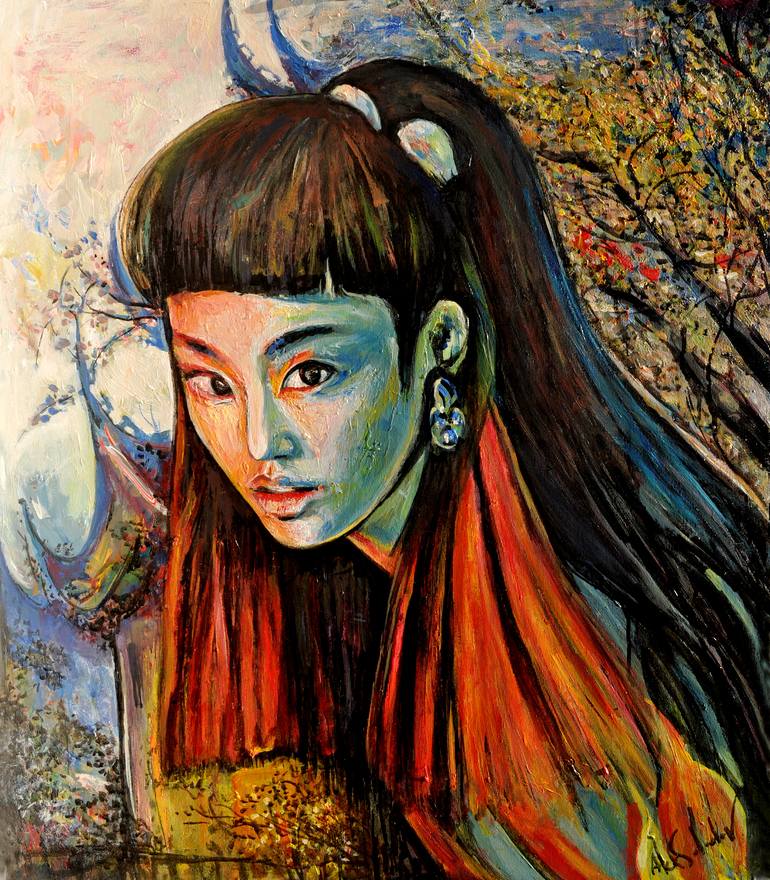 Spirit of the Temple in Mountains - acrylic painting portrayed a young Japanese girl wearing in traditional kimono as a spirit of a temple in mountains. In Japanese mythology 'kami' - word for a god, deity, divinity, or spirit. Kami are of two minds. They can nurture and love when respected, or they...
