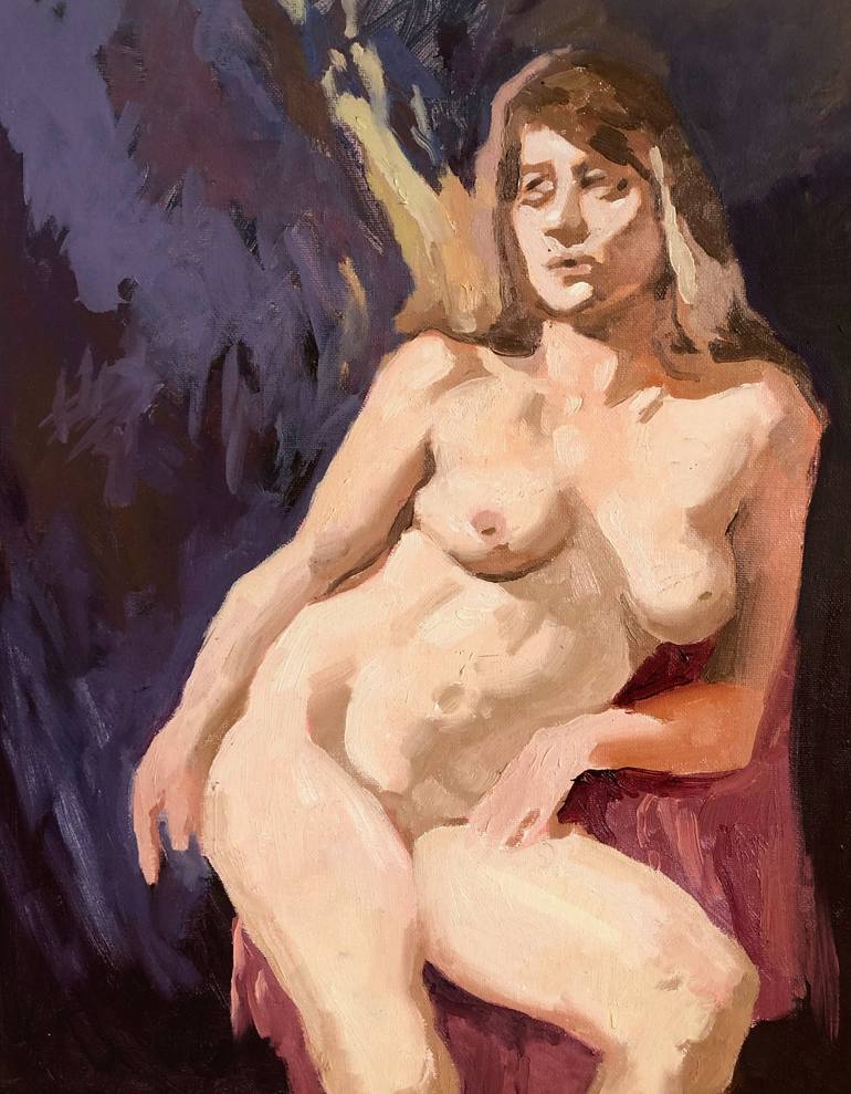 A seated woman leaning to one side. The dynamic pose as well as the movement of the background express energy and vitality.