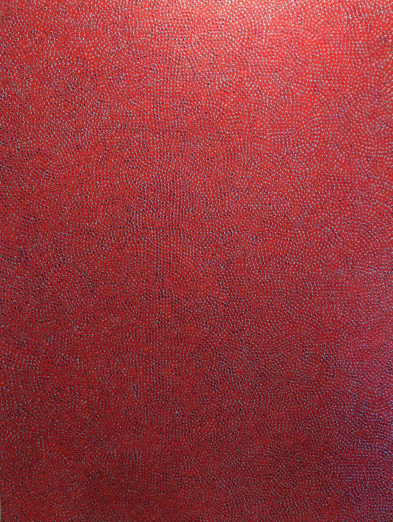The artwork consists of an abstract composition densely packed with small, intricate patterns in vibrant red tones. The entire piece is covered in a highly textured surface, reminiscent of countless tiny undulating shapes that create a dynamic and slightly hypnotic visual effect. The red hues domina...