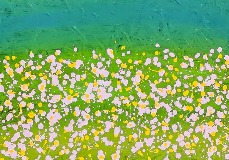 "Spring Aesthetic" is an original abstract painting that captures the essence of a wildflower field in spring. Bright yellows and whites dance across a vibrant green background, creating a sense of joy and renewal. This modern wall art is an acrylic painting on canvas. Multiple layers of high-quali...