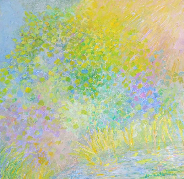An imagined scene of pastel colors in springtime came to me from my love of spring and new growth. I used a palette knife and oil paint - oil paint for the subtlety and my palette knife for the ease of application. I hope to elicit a smile from the viewer who chances upon this painting. It is framed...
