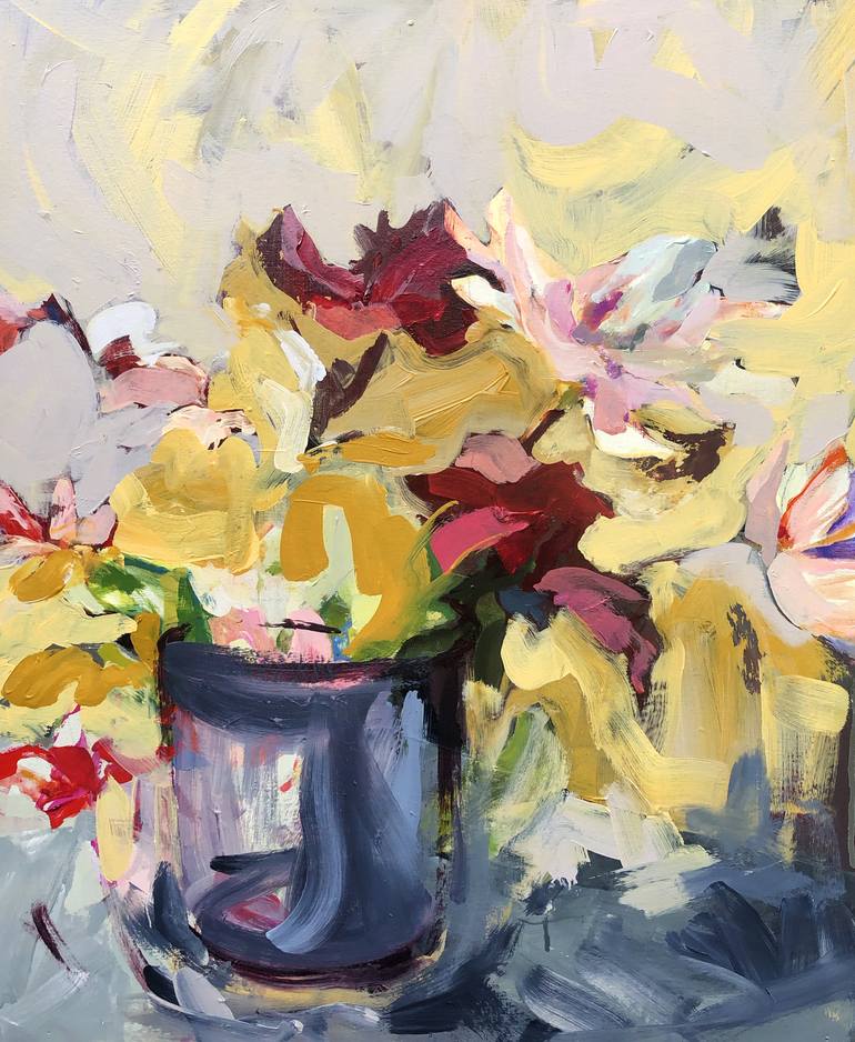 A loosely painted colourful bunch of wild spring flowers. Typical Dutch custom to always have fresh flowers in a vase in your home. Spring is the time of the year in the Netherlands the colourful tulips are everywhere. Painting this in different stages, from daylight and civilised towards more blunt...
