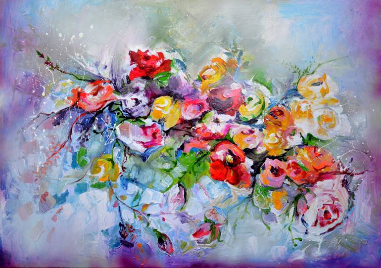 Spring Haiku A beautiful modern floral abstract painting, made with professional varnished acrylics, glass color and Amsterdam acrylic sprays on stretched heavy canvas. Dimensions: 100X70X4 cm It is signed and dated on the front by the artist: Soos Roxana Gabriela, all the paintings will have a Cert...