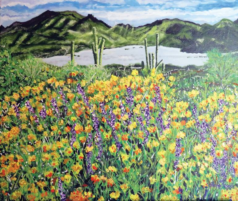 This painting was inspired by a beautiful photo of Bartlett Lake taken by Paul Folk of Paul Folk Photography in Prescott Valley, Arizona. Only 49 miles (79 km) from Phoenix, the lake is actually a reservoir that was formed by the damming of the Verde River. The painting blends the atmospheric quali...