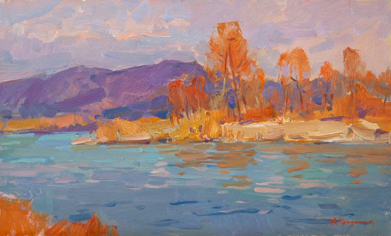 April sunny evening by the river ARTIST: Aleksandr Kryushyn WORK: Original oil Painting, Handmade artwork, One of a Kind MEDIUM: oil on panel YEAR: 2018 TITLE: "Spring evening. Tisza River" SIZE: 30х50х0.3 cm. / 11,9"x 19,7"x0,12 in. Unframed. The picture is created on the high-quality panel. Bright...