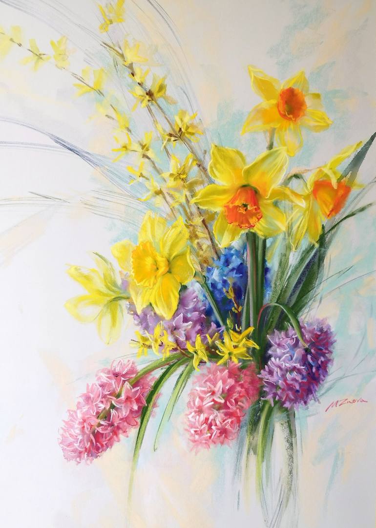 Golden daffodils, Scented hyacinths mingle, Forsythia shines. Softpastel Sennelier, watercolor on Pastelmat paper. Made in Ukraine